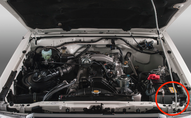 2. With the bonnet open, locate the windscreen washer fluid bottle – on the Toyota Land Cruiser 79, it's behind the passenger-side headlight, next to the battery.