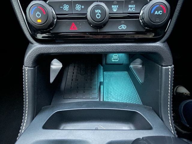 Then there's the general, practical, no-nonsense dashboard layout with a bit of a Scandinavian spin to it, i.e., there's nothing superfluous, and it has a smidge of backlighting and elegant wooden inlays. The honeycomb design of the air-conditioning vents doesn't really go with the rest, but that's just my opinion. It blows air cooler than the arctic, and I don't have to dive into menus on the mammoth touchscreen for that to happen, which is always a win in my books.