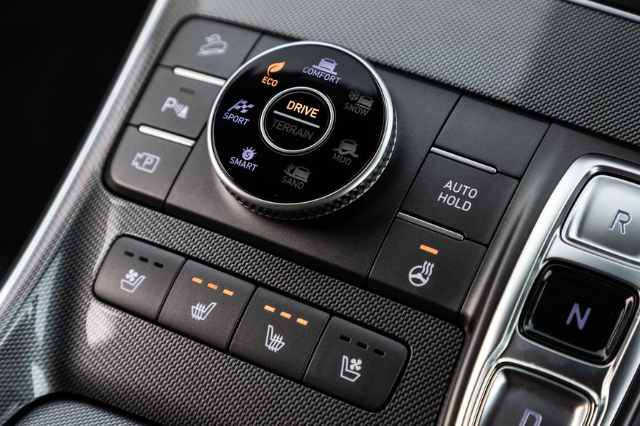 The interior is best characterised as premium, with an array of features that took us several days to fully utilise and experience. From an ergonomics perspective, Hyundai has done a good job of simplifying things, and even though there is a plethora of buttons at your disposal, the layout is functional and doe not appear cluttered. The centre console does not feature a gear level, but instead three buttons allowing you to select Drive, Neutral and reverse. Next to the gear select buttons is the drive and terrain selection button, a heated steering wheel function, heated/ventilated seat function as well as the parking assistance system settings.